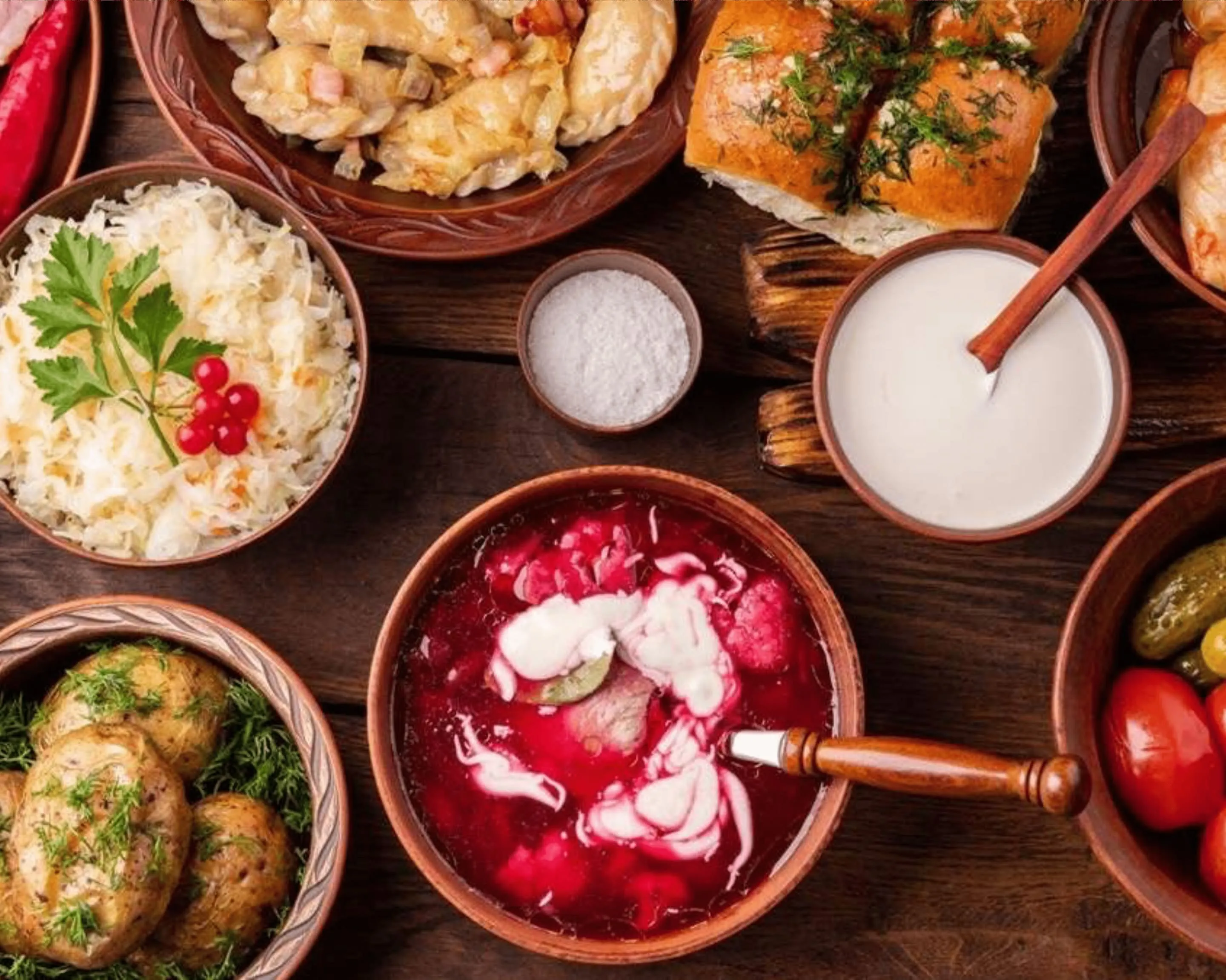 A hearty, slow-cooked soup made with beef, beets, cabbage, potatoes, onions, carrots, and tomatoes. Simmered to perfection and served with pampushka (traditional garlic bread) and a dollop of sour cream.